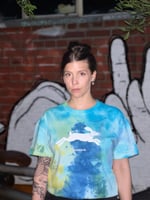 Oversized geschnittenes T-Shirt aus schwerer Baumwolle (100% Cotton, 240 g/sm, OEKO-TEX® Standard 100) mit einfarbigem Chestprint. Von Hand gebatikt, dadurch ist jedes Piece ein Unikat! Das Shirt hat überschnittene Schultern und fällt lässig aus, bitte beachte die Größentabelle in der Bildergalerie. Wenn du einen klassischeren Fit möchtest, am besten eine Konfektionsgröße kleiner bestellen.